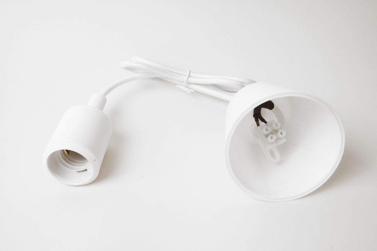 Es ist eine Hängeleuchte mit textilummanteltem Kabel in weißer Farbe. Kunststoffrosette, Textilkabel und Lampenfassung mit Silikongehäuse, alles passend in der gleichen Farbe.