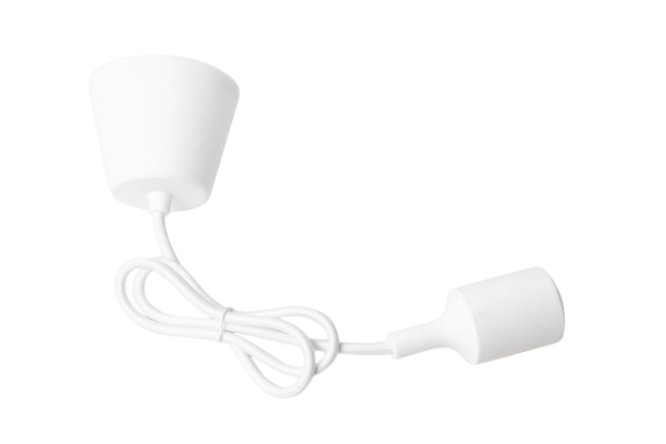 Es ist eine Hängeleuchte mit textilummanteltem Kabel in weißer Farbe. Kunststoffrosette, Textilkabel und Lampenfassung mit Silikongehäuse, alles passend in der gleichen Farbe.