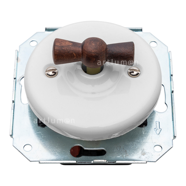 Aus-Wechselschalter hergestellt aus weißem Porzellan mit Schleife (Griff) aus Buchenholz natur gebeizt Farbe kastanienbraun dunkel. Für Unterputzmontage in Universaldose (Gehäuse rund oder quadratisch). Lichtschalter die an eine andere Epoche erinnern, ein Luxus für Gesichts- und Tastsinn. Aus-Wechsel-Drehschalter (erlaubt das kombinierte Einschalten von zwei Punkten aus).