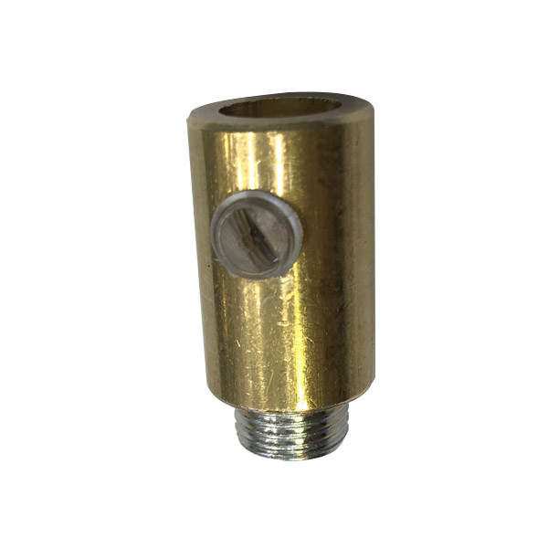 Stück hergestellt aus Messing, das als Zierabschluss von Kabeln mit großem Durchmesser, speziell für Seil- oder Jutekabel, verwendet wird. Es hat einen Eingang für das Kabel, mit einem Hohlraum von 9mm. Die seitliche Kabelverschraubung aus Kunststoff ist verstellbar. An seinem anderen Ende hat es einen Eingang mit Innengewinde, mit Gewindesteigung 10/100, für ein Gewinderohr von dieser Gewindesteigung (beim Stück mit inbegriffen). Es kann an Haken, Ösen, Deckenrosetten, Lampenfassungen etc. gschraubt werden.