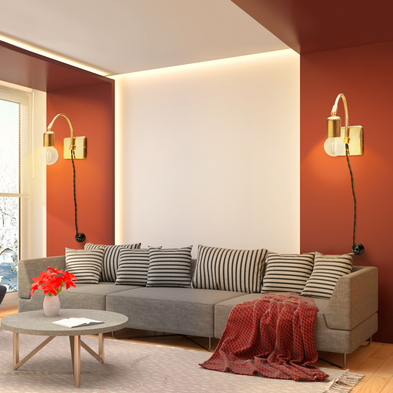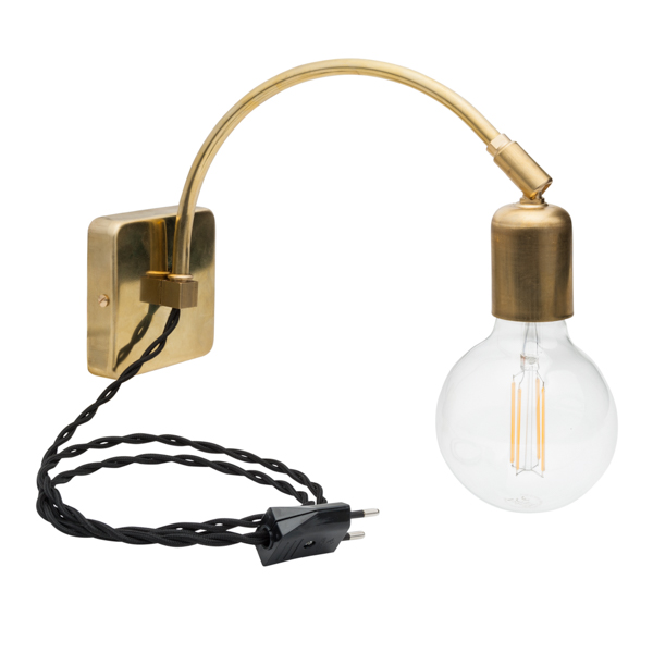 Wandstrahler in anmutiger Industrieästhetik. Armkonstruktion aus röhrenförmigem Messing und Lampenfassung aus Messing. Wandbasis quadratisch, Arm aus Messing der aus einem anmutigen Würfel, ebenfalls aus Messing, emporragt, ein Gelenk, das erlaubt mit dem Einfallswinkel der Glühbirne zu spielen, das an einer von einer Kappe aus dem gleichen Material verhüllten Lampenfassung befestigt ist. Stilvoller Strahler mit Außenkabel, um sich an jegliche Wand anzupassen, ohne die Notwendigkeit dass die Kabel eingelassen sind. Dieser Strahler mit der quadratischen Wandhalterung und dem freien Arm und Glühbirne ergänzt sich mit den neuen und modernsten Einrichtungstendenzen.