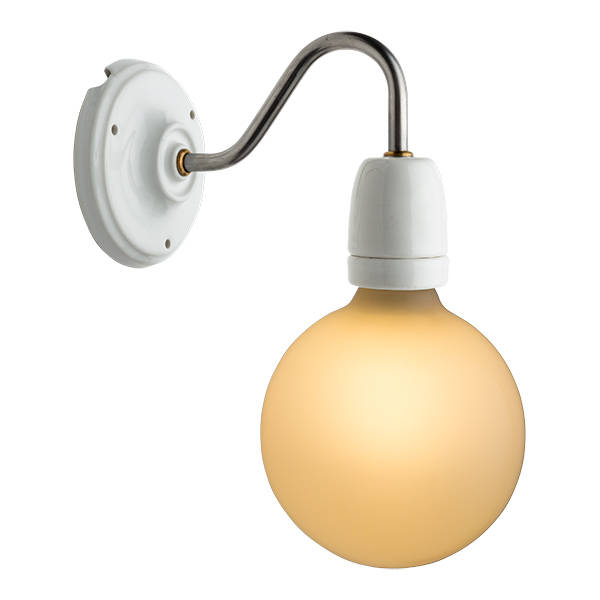 Wandstrahler aus Porzellan weiß. In diesem Design wird der klassische gebogene Arm mit dem modernen Touch der freien Lampenfassung aus Porzellan und Glühbirne gemischt. Bestehend aus Wandhalterung in Porzellan weiß, weiß lackiertem Metallarm und Lampenfassung ebenfalls aus Porzellan weiß. Vermittelt Gelassenheit und Ruhe. Ideal um Bäder zu dekorieren; zu beiden Seiten des Spiegels angebracht, beleuchtet er nicht nur sondern dekoriert und schafft gleichzeitig ein modernes Ambiente. Wenn Sie eher einen Retroeffekt wünschen und der Spiegel nicht sehr groß ist, kann er perfekt zentriert werden, und ermöglicht so, dass sich das reflektierte Licht im Spiegel vervielfacht. Mit seinen weichen Linien glänzt der Strahler in jeglicher Ecke. Empfohlen wird die Glühbirne LED Globe von 95mm Durchmesser.