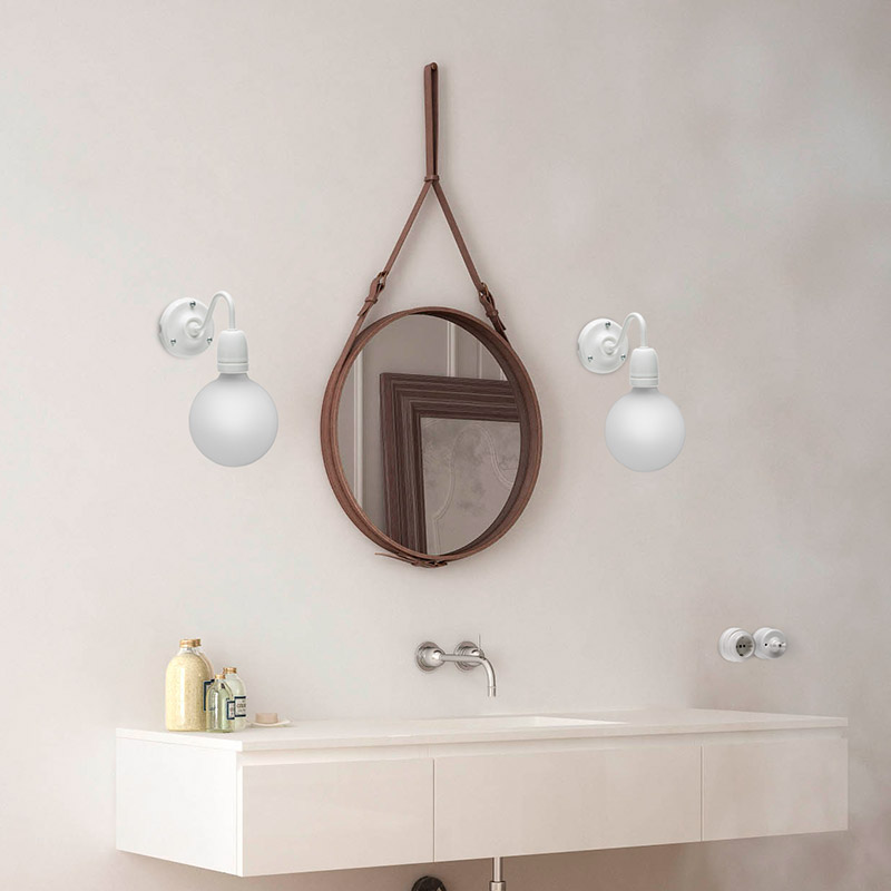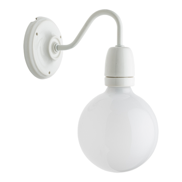 Wandstrahler aus Porzellan weiß. In diesem Design wird der klassische gebogene Arm mit dem modernen Touch der freien Lampenfassung aus Porzellan und Glühbirne gemischt. Bestehend aus Wandhalterung in Porzellan weiß, weiß lackiertem Metallarm und Lampenfassung ebenfalls aus Porzellan weiß. Vermittelt Gelassenheit und Ruhe. Ideal um Bäder zu dekorieren; zu beiden Seiten des Spiegels angebracht, beleuchtet er nicht nur sondern dekoriert und schafft gleichzeitig ein modernes Ambiente. Wenn Sie eher einen Retroeffekt wünschen und der Spiegel nicht sehr groß ist, kann er perfekt zentriert werden, und ermöglicht so, dass sich das reflektierte Licht im Spiegel vervielfacht. Mit seinen weichen Linien glänzt der Strahler in jeglicher Ecke. Empfohlen wird die Glühbirne LED Globe von 95mm Durchmesser.