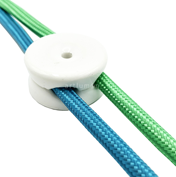 Kabelhalter für Wand oder Decke aus weißem Porzellan. Ideale Ergänzung für sichtbare Installationen mit dekorativen Textilkabeln.